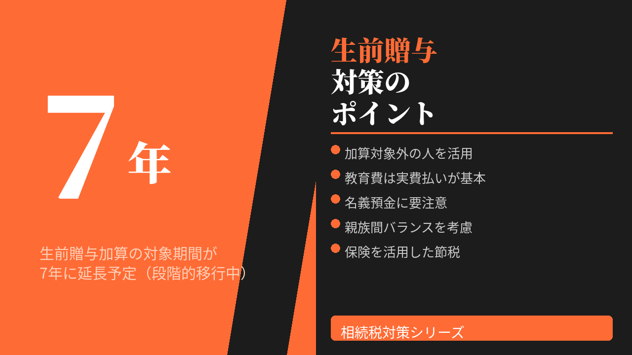 現状では3年から順次延長の期間に入っており最終的には7年間の持ち戻し期間になる予定です。亡くなる前7年間に行われた贈与については、足し戻し計算の対象になるということです。